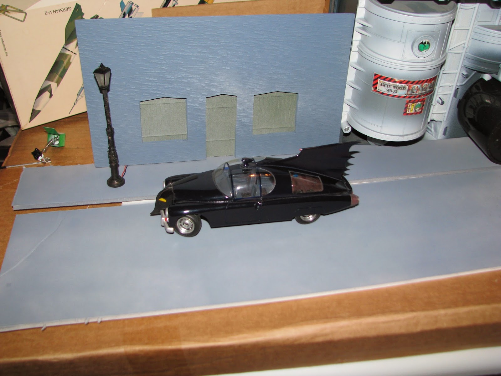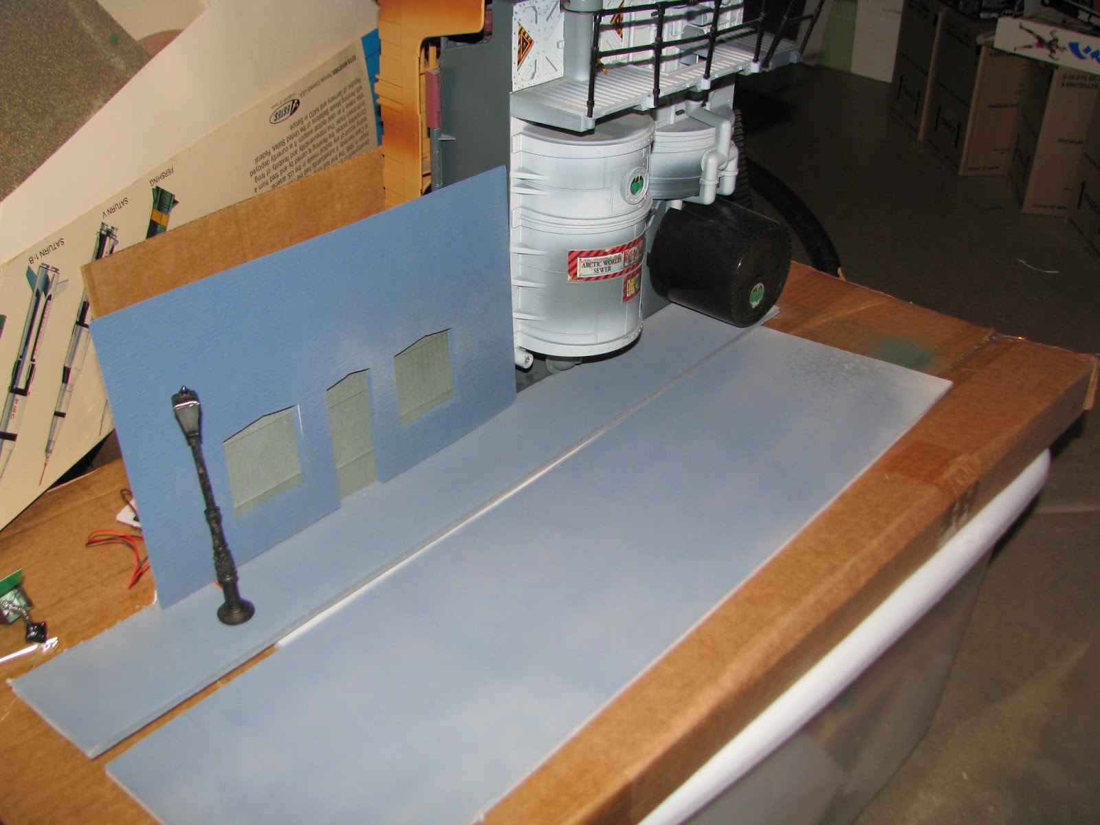 I grabbed my BATMAN RETURNS BATCAVE COMMAND CENTER, which has the Penguin's Arctic Lair as a scale back piece and tried to make an alley-way store entrance based on some screen shots from... BATMAN RETURNS.