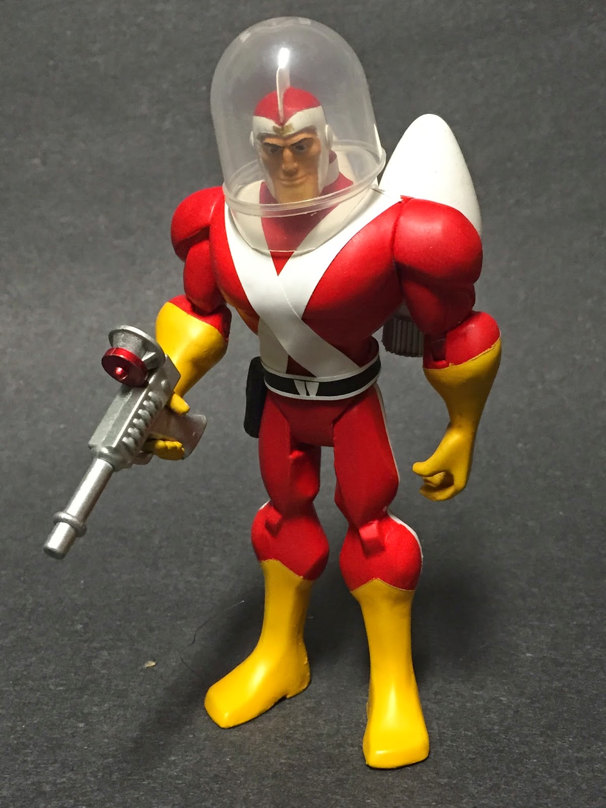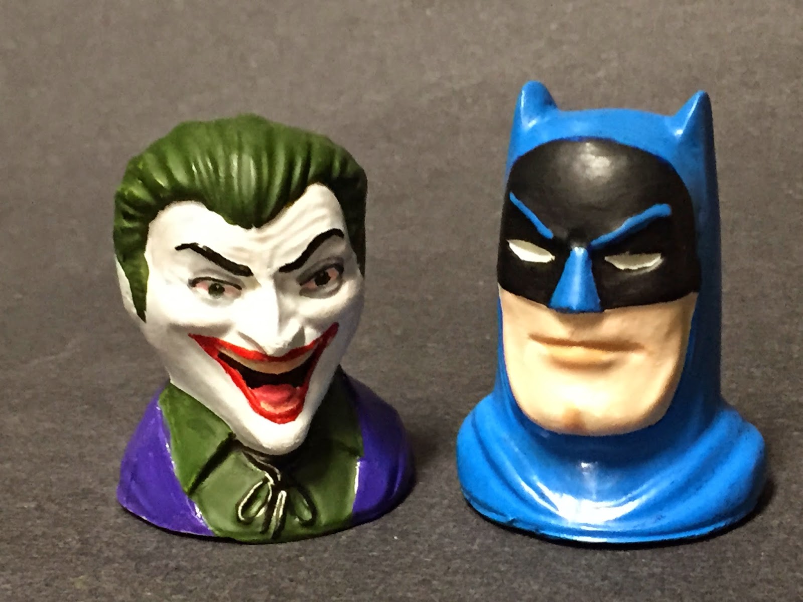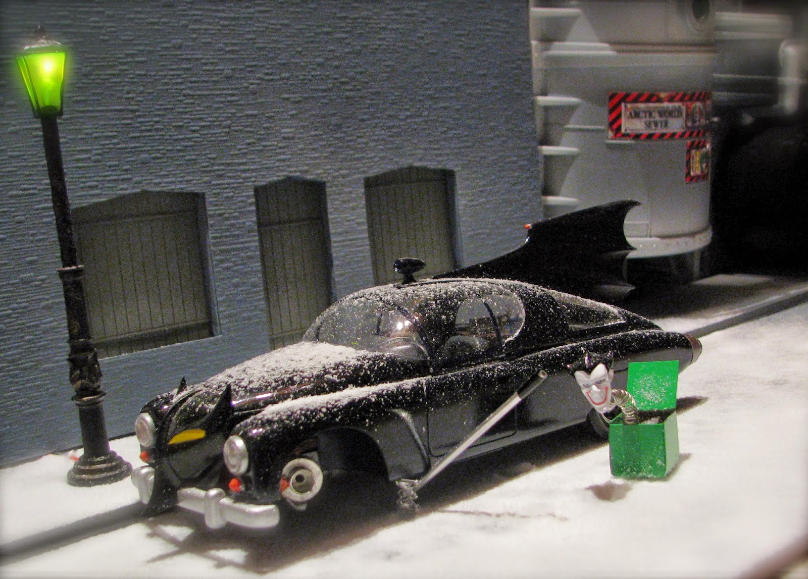 I played around with a prop that really cemented the visual for The Joker line of the rhyme. I sliced off the head of a PVC animated Joker figure, located a spare spring from the parts box, and made a box out of sheet styrene. Some lead weight held it all down.